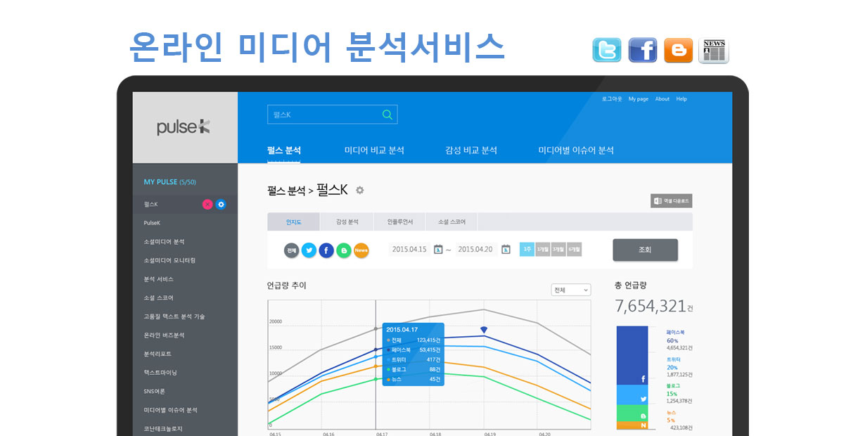 펄스K는 소셜미디어상에서 자발적으로 이루어지는 기업브랜드에 대한 소비자들의 평판을 실시간으로 수집하고 분석하여 숨어 있는 Needs를 쉽게 파악할 수 있도록 돕고 실시간 대응이 가능한 소셜미디어 모니터링&분석 서비스입니다.