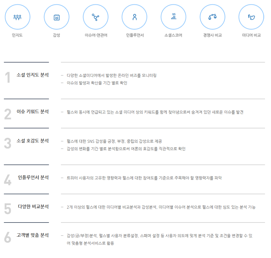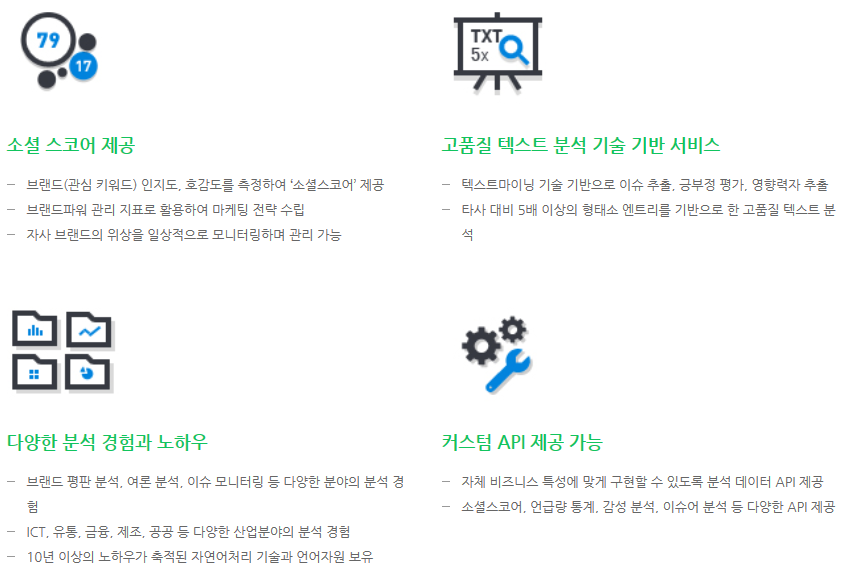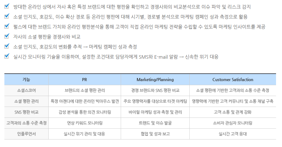 온라인 상에서 SNS, 뉴스, 블로그 등을 통해 자발적으로 확산되는 소비자의 여론을 실시간으로 모니터링 하고, 이를 다양한 기준으로 분석하고는 텍스트 마이닝 기반의 리스닝 플랫폼입니다.