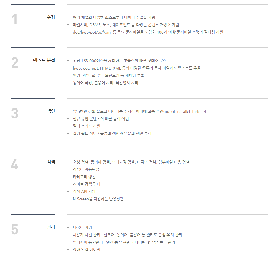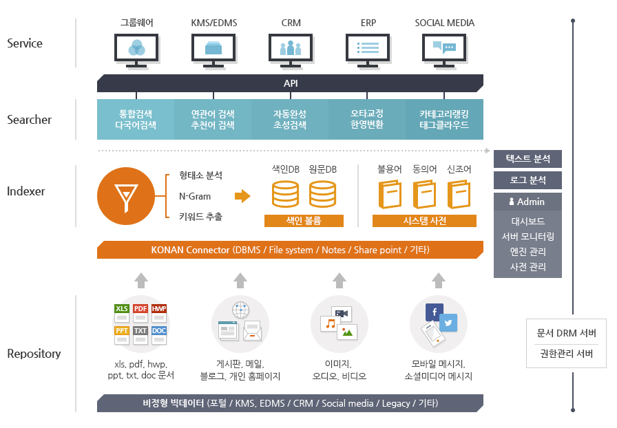 특히, 내부 데이터 이외에 다양한 외부 데이터를 수집하여 빅데이터를 통합분석하고자 하는 고객들은 전보다 더 방대한 데이터를 빠르고 스마트하게 검색할 수 있는 솔루션이 필요합니다. ‘코난 서치 4’는 이와 같은 고객 요구를 충족하기 위해 개발된 프리미엄급“빅데이터 검색 솔루션”입니다.