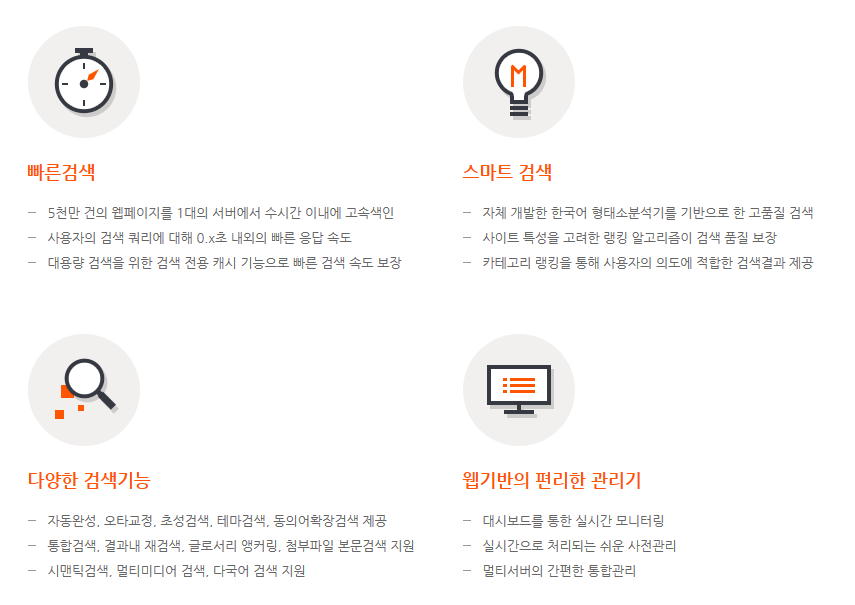 비즈니스가 성장하면서 웹사이트나 인트라넷의 트래픽과 콘텐츠가 증가하고 있습니다. 이때 대용량 통합검색엔진을 구축한다면, ‘웹사이트 방문자(고객)’와 ‘인트라넷 사용자(직원)’들이 원하는 콘텐츠(상품/정보)를 빨리 찾을 수 있고, 여러분의 비즈니스는 더 빠르게 성장할 것입니다. ‘코난 서치 4’는 고속 성장하는 비즈니스를 위한 성공 파트너입니다.